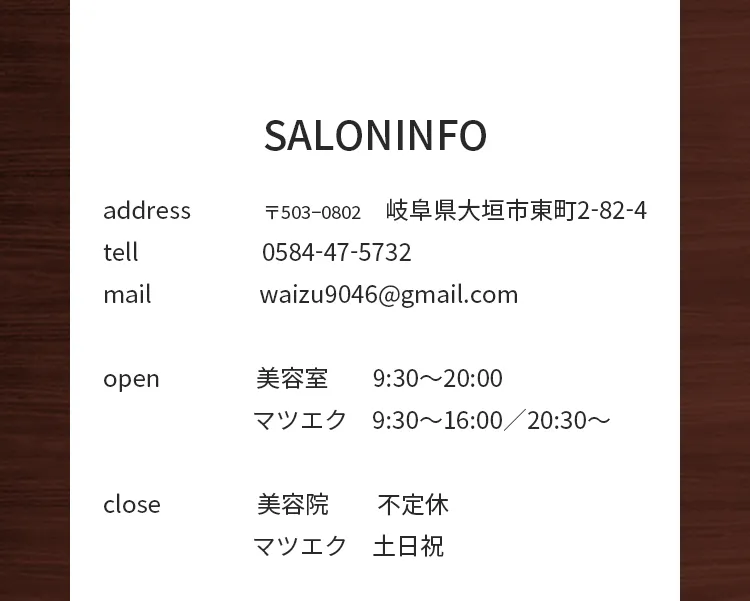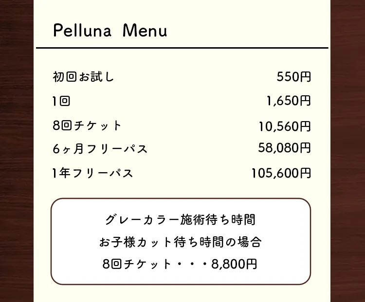 grayカラーリタッチ 4,400円or4,950円~ grayカラーfull 4,950円or5,500円~ リタッチ 4950円~ full 5,500円~ full long 6,050円~ メンズカラー 4,400円~ メンズカラーS 3,850円~ ハイライト(部分) 2,200円~ ハイライト(all) 5,500円~ allブリーチ 5,500円~